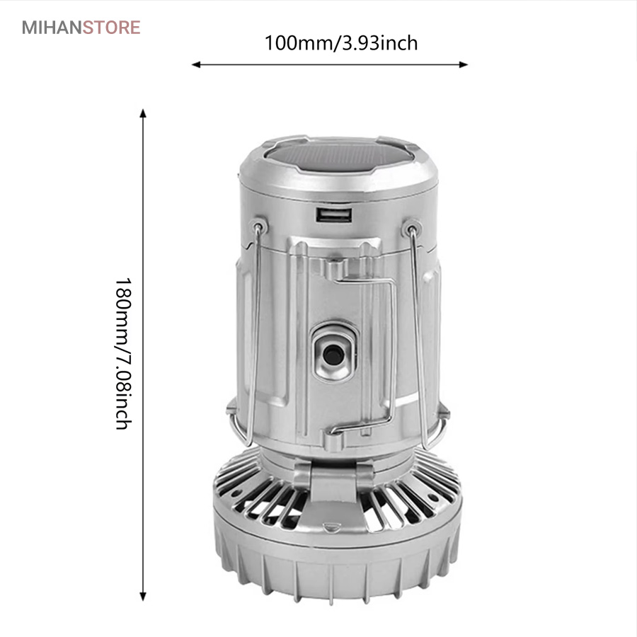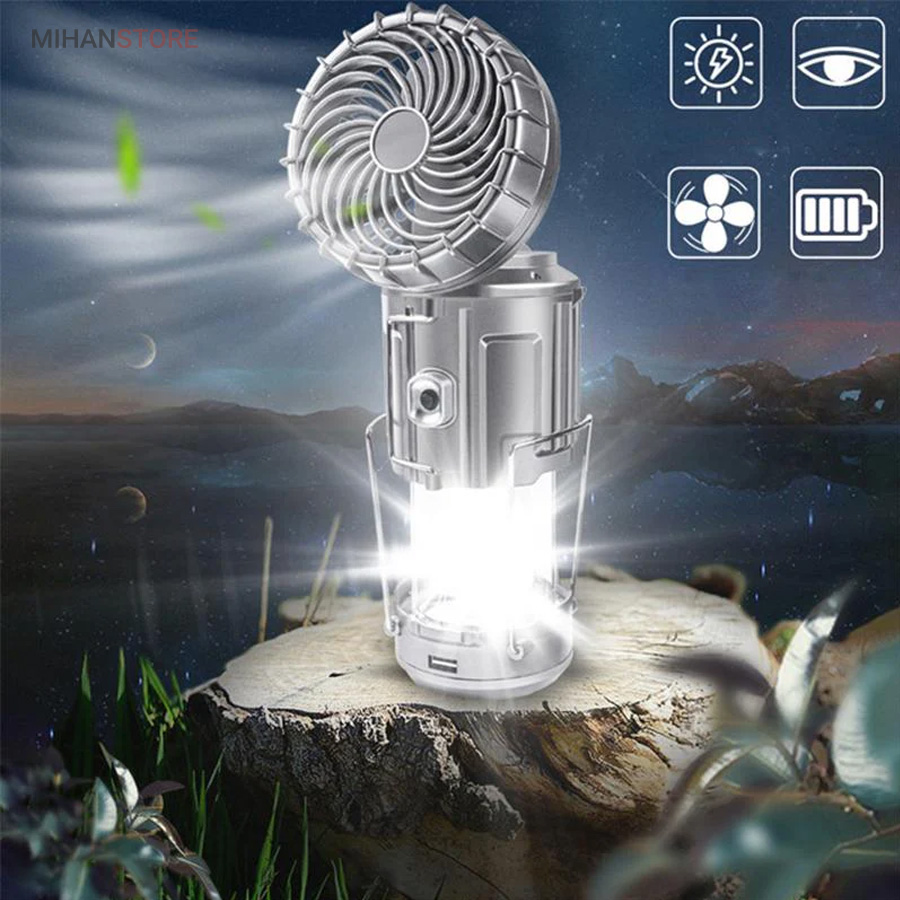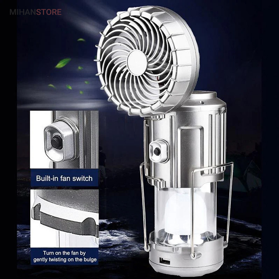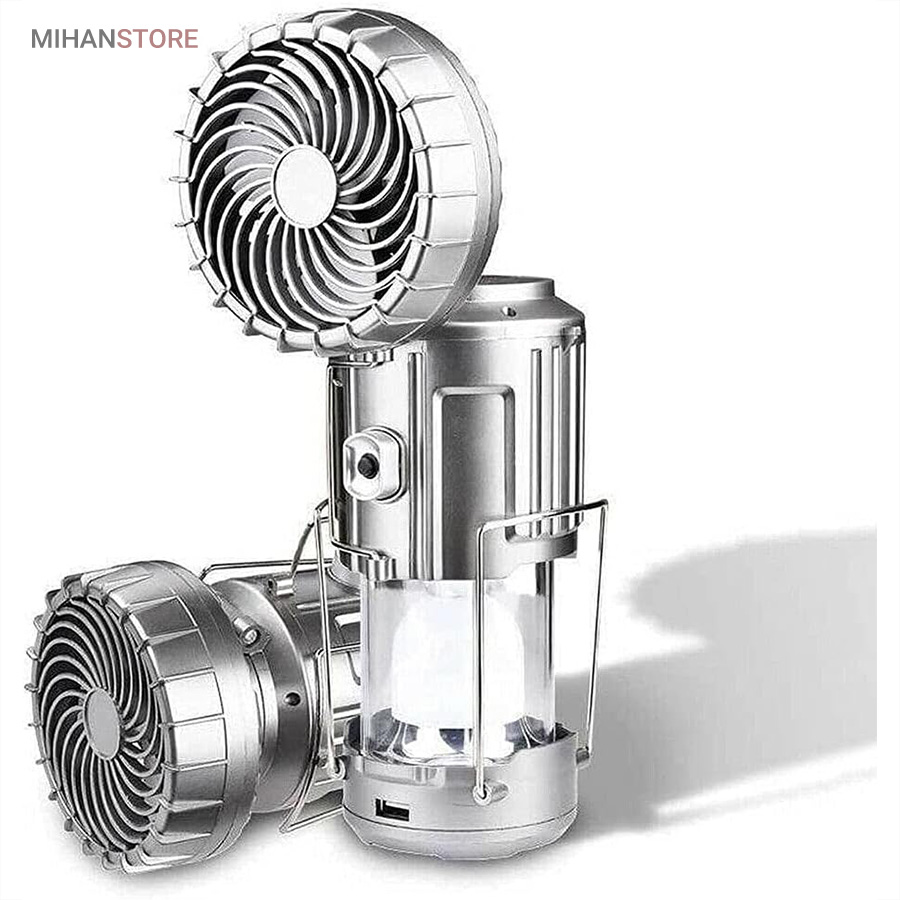 چراغ کمپینگ خورشیدی دارای پنکه و پاوربانک محصولی ساده درعینحال کاربردی است که میتواند در زمان سفر یا در شرایط اضطراری در شهر مورد استفاده قرار گیرد. در قسمت بالایی این فانوس، دو دستهی فلزی قرار دارد؛ به همین دلیل میتوان آن را داخل چادر یا هر سطح برجستهای آویزان کرد و از نور آن بهره برد. چراغ کمپینگ و پاوربانک خورشیدی چندکاره همراه خوبی برای سفر به طبیعت،