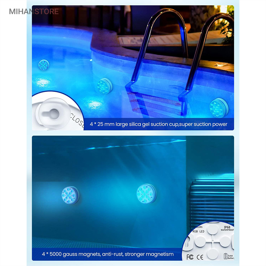 ایده آل برای استخر، وان حمام، حوض، فواره، آبشار، آکواریوم، گلدان، باغ، باغچه، عروسی، مهمانی و غیره. این محصول طراحی ضدآب بسیار قدرتمندی دارد، حلقه مهر و موم خارجی سیلیکاژل مقاوم در برابر حرارت دارای اثر ضد آب بهتری نسبت به سایر چراغ های استخر دارد، از ورود کامل آب جلوگیری می کند و عمر طولانی را تضمین می کند. نمای بیرونی ABS ضخیم شده، محافظت در برابر خوردگی و سفتی را نشان می دهد. دارای 16 رنگ، 5 سطح روشنایی، 3 حالت نور و 3 عملکرد تایمر (2 ساعت، 4 ساعت، 6 ساعت)، شما می توانید آن را به دلخواه تنظیم کنید.