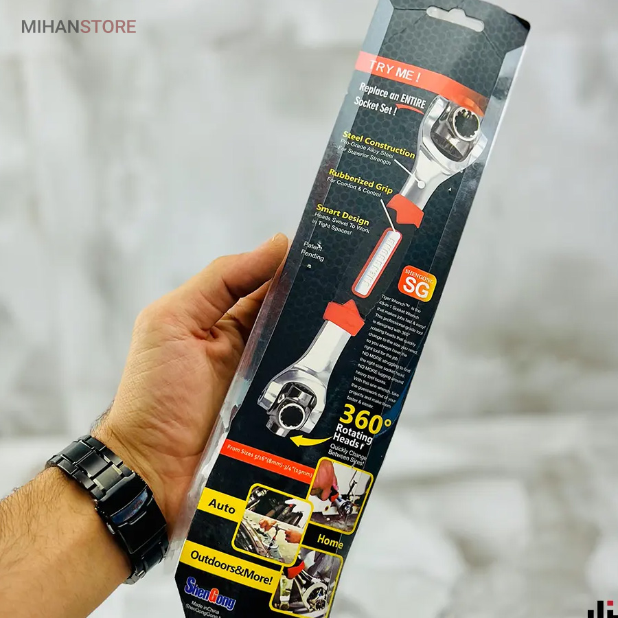 آچار همه کاره تایگر، ابزاری کارآمد و پرکاربرد است که برای انجام مجموعهای از کارها در خانه و خودرو طراحی شده است. این ابزار با ویژگیهای منحصر به فرد خود، جایگاه ویژهای در جعبه ابزار هر فردی خواهد داشت. بدنه این آچار از استیل مقاوم و ضد زنگ ساخته شده که تضمین کننده طول عمر بالا و مقاومت در برابر شرایط مختلف است. دسته لاستیکی ضد لغزش نیز راحتی و ایمنی استفاده از این ابزار را افزایش میدهد و مانع از سر خوردن آن در دست میشود.یکی از ویژگیهای بارز آچار همه کاره تایگر، دارا بودن ۸ سری قابل چرخش ۳۶۰ درجه با اندازههای مختلف (19x17x16x14x13x11x10 میلیمتر) است.